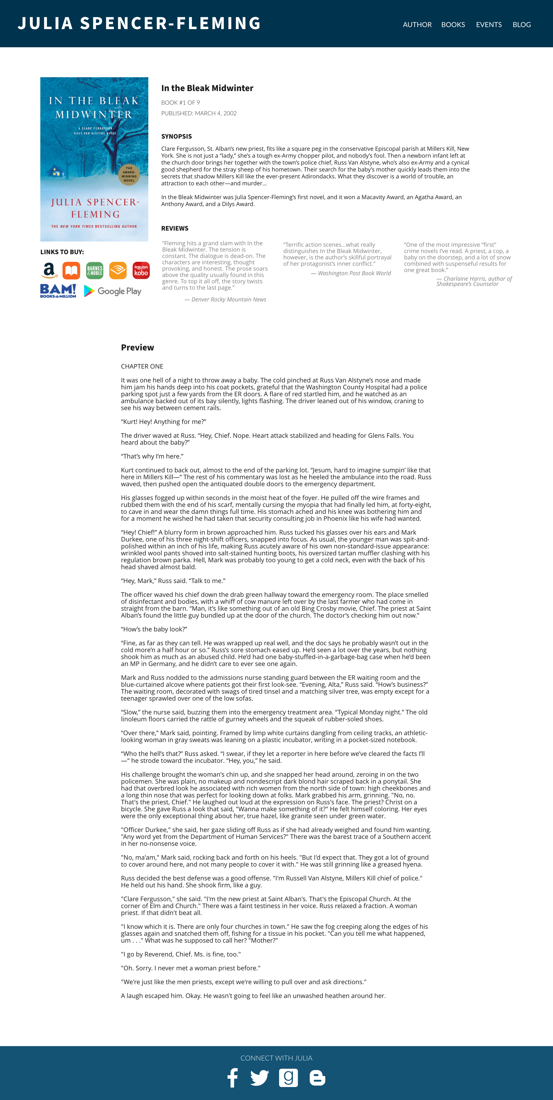 I designed a website for mystery author Julia Spencer-Fleming - I decided on Spencer-Fleming as my author of choice because I am a particular fan of her Anthony, Agatha, and Macavity Award-winning The Rev. Clare Fergusson & Russ Van Alstyne Mysteries series. Furthermore, although Spencer-Fleming does take part in a shared blog with other writers, she does not already have an official site established.